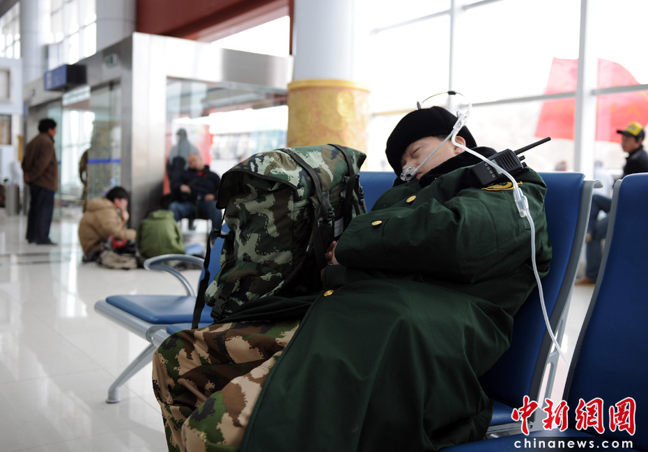 15日青海玉樹地震救援進入第二天,各方救援人員不斷趕來。由于玉樹縣海拔高達4000米,許多外地救援者一時難以適應。記者救援現場了解到,一些救援者出現身體不適,而目前災區又缺乏抗高原反應藥物。圖為一位救援人員在玉樹機場大廳吸氧。中新社發 符永康 攝