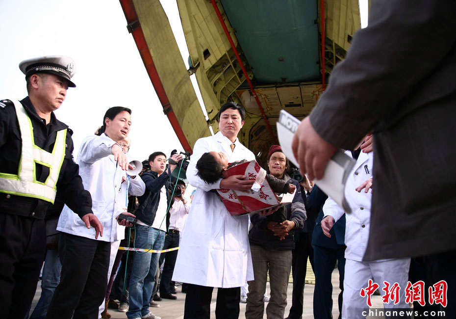 一架載有青海玉樹地震首批傷員及傷員家屬的中國空軍運輸機抵達成都雙流國際機場,其中35名地震傷員將被分別送往四川省人民醫院和四川大學華西醫院進行治療,運輸機于15日下午15時30分從玉樹當地機場起飛,經過1小時30分的飛行,歷程800公里,于4月15日下午17時03分,順利抵達成都。圖為醫院搶救人員正將受傷小孩從飛機抱往救護車。中新社發 張浪 攝