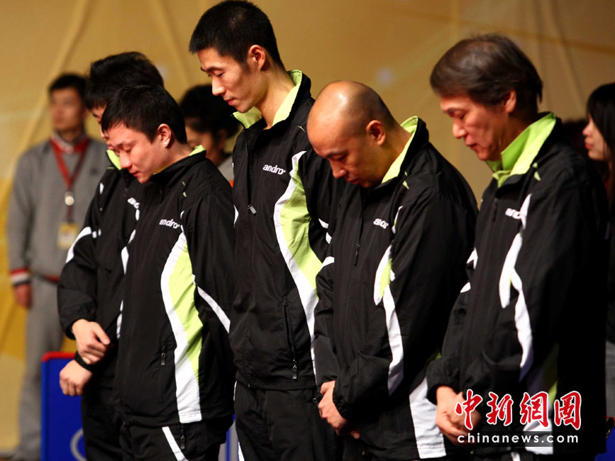 4月15日,亞歐乒乓球全明星對抗賽在北京進(jìn)行第二天的爭奪。賽前,現(xiàn)場所有球員和觀眾為青海玉樹地震災(zāi)區(qū)的遇難同胞默哀一分鐘,組委會宣布將把本次賽事的全部票房收入捐贈地震災(zāi)區(qū)。中新社發(fā) 富田 攝