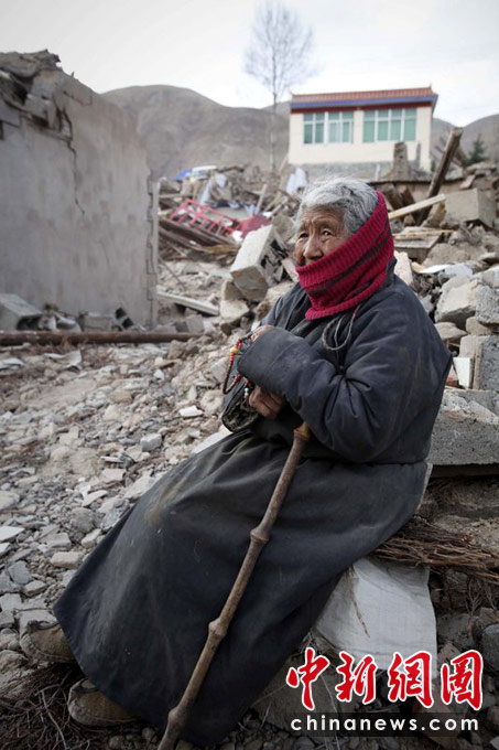 圖為4月15日,青海玉樹,新建路,84歲的老奶奶卓瑪坐在家門口,她說她46歲的女兒已經在地震中遇難了。(CFP 圖)