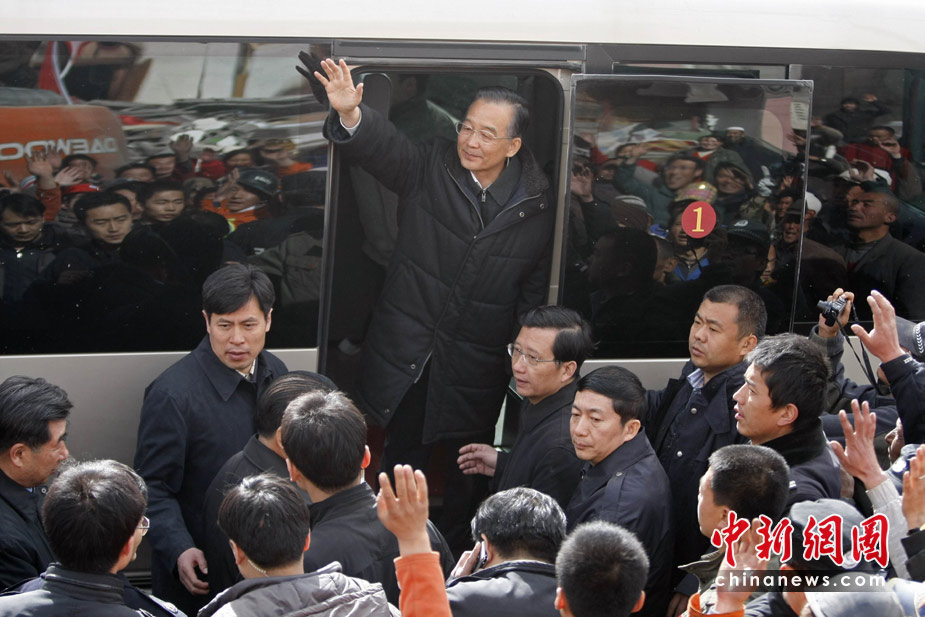 2010年4月16日,中國國務院總理溫家寶在青海省玉樹藏族自治州玉樹縣地震災區視察救援現場。4月14日07時49分許,青海省玉樹藏族自治州玉樹縣(北緯33.1,東經96.7)發生7.1級地震。中新社發 盛佳鵬 攝