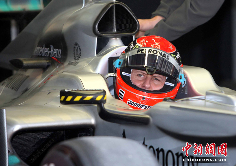 4月16日,2010國際汽聯F1世界錦標賽上海站在上海國際賽車場開始車手第一、第二次練習賽。圖為代表梅賽德斯GP車隊出戰的老車王、德國車手舒馬赫重回上海賽道。 中新社記者 任晨鳴 攝