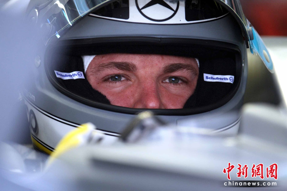 4月16日,2010國際汽聯F1世界錦標賽上海站在上海國際賽車場開始車手第一、第二次練習賽。圖為代表梅賽德斯GP車隊出戰的德國車手羅斯伯格。 中新社記者 任晨鳴 攝