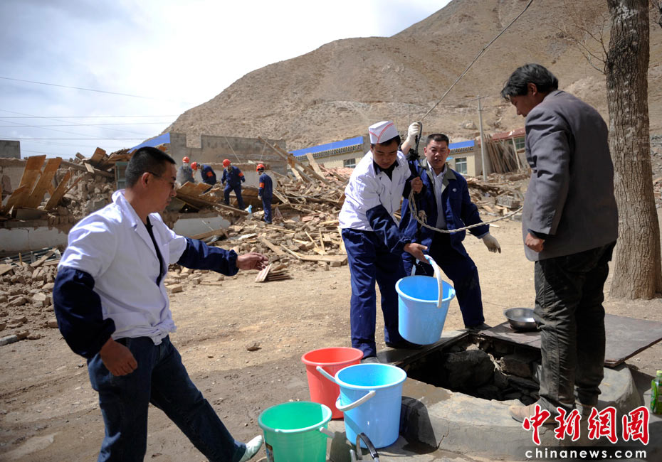 4月16日,青海玉樹民族綜合職業(yè)學校生活保障人員提取地下水飲用。中新社發(fā) 廖攀 攝