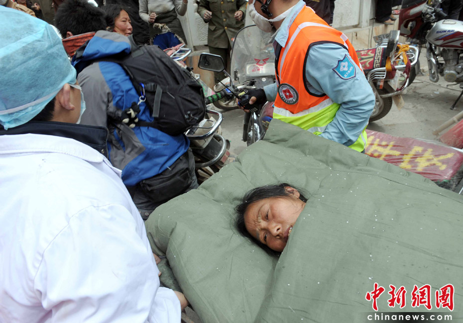 4月17日13點38分許,搜救隊在玉樹結古鎮成功救出一名中年婦女,幸存者神志清醒,還睜著眼睛,據悉腿部、腰部受傷。中新社發 陳文 攝