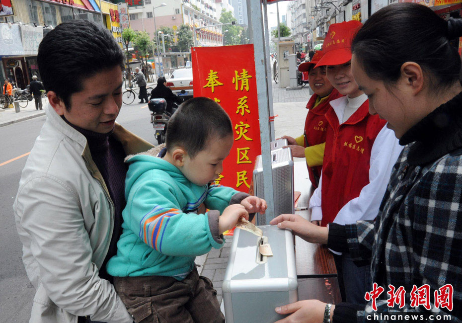 4月17日,一名兒童在家長的帶領(lǐng)下來到福州市區(qū)設(shè)立的捐款箱向青海省玉樹地震災(zāi)區(qū)捐款。當(dāng)日是周六假日,不少福州市民紛紛前往由福建省紅十字會(huì)、福州市紅十字會(huì)、福建慈善總會(huì)等在街頭設(shè)立的捐助點(diǎn),踴躍向青海省玉樹地震災(zāi)捐款。中新社發(fā) 劉可耕 攝