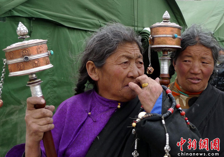 4月17日傍晚,玉樹震區街頭,兩位藏民轉經祈福。中新社發 孫自法 攝