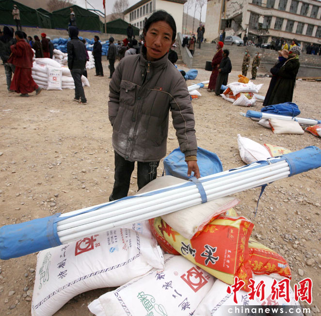 4月17日,大批救災物資抵達青海省玉樹地震災區,當地政府及時組織將救災帳篷和糧食分發到災民手中。圖為玉樹清水河鄉的受災民眾領到全家的救災物資糧食和帳篷。中新社發 劉忠俊 攝