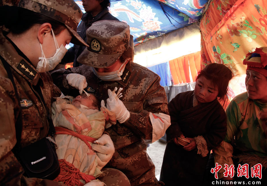4月18日,總后青藏兵站部抗震醫療隊在青海玉樹震中結古鎮展開救援的同時,還派員向周邊牧區巡診,救治傷病員。圖為醫務人員為黃林格頭牧區索南求幾的嬰兒進行檢查和護理。據悉,這個牧區所有房屋在地震中被損毀,不少牧民在地震中受傷,目前住在搭建的帳篷里。中新社發 鄒小慶 攝