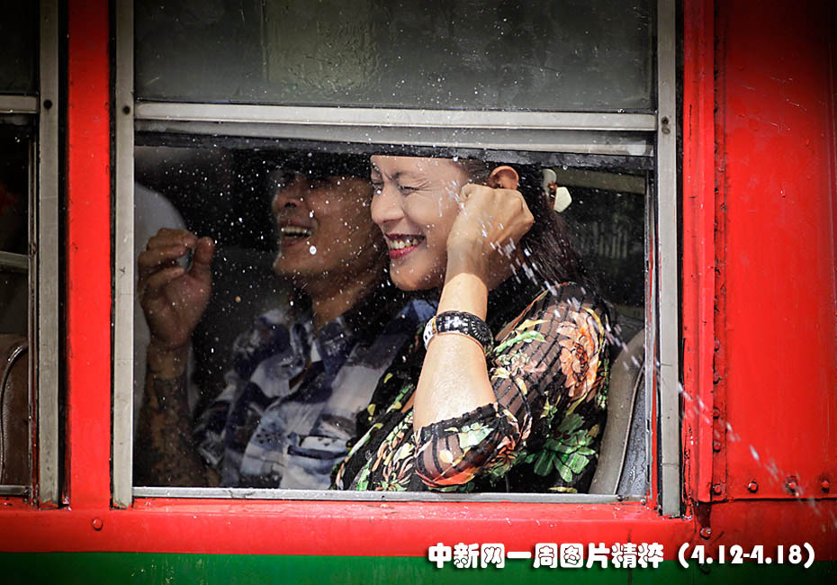 4月14日周三,在泰國(guó)曼谷舉行的泰國(guó)新年慶;顒(dòng)中,巴士上的乘客被窗外射來的水擊中。