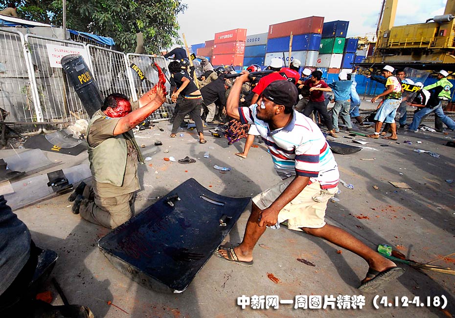 4月14日周三,在印度尼西亞首都雅加達,一名示威者在沖突中毆打一名警員。示威者手持砍刀和棍棒,抗議政府試圖拆除一名18世紀阿拉伯伊斯蘭傳教士的墳墓。