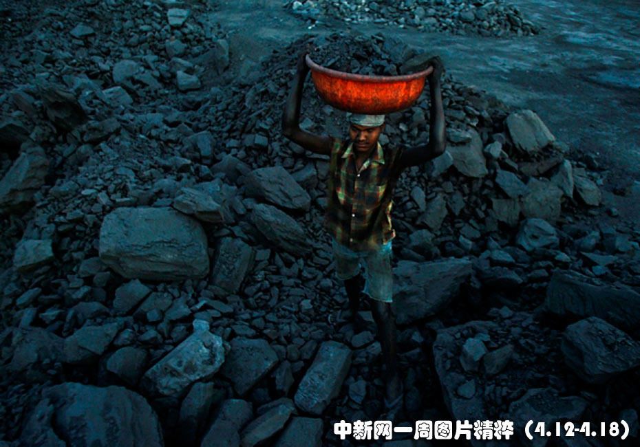 4月12日周一,在印度奧里薩邦的一座煤礦附近,一名工人正在搬運煤炭。