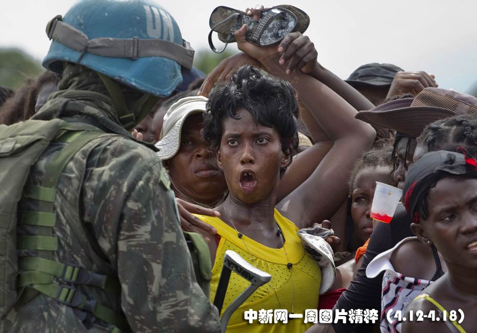 4月12日周一,海底太子港一個無家可歸的地震幸存者與前來分發食品的巴西聯合國維和人員發生口角。
