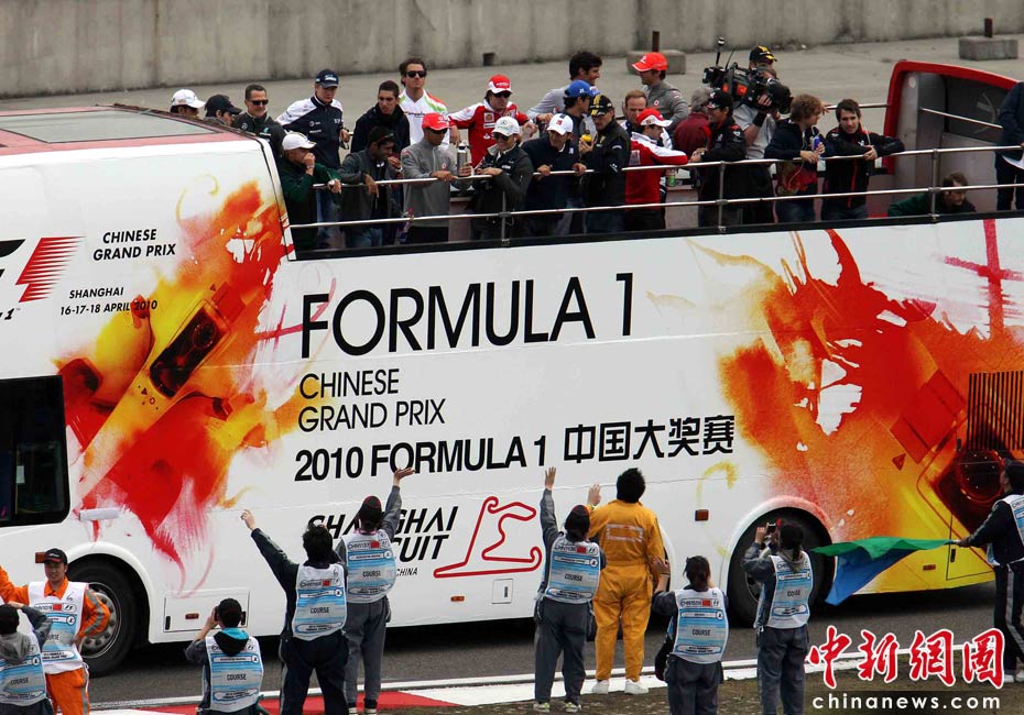 4月18日下午,2010國際汽聯(lián)F1世界錦標(biāo)賽上海站在上海國際賽車場舉行正式比賽,賽前24名參賽車手按照慣例乘坐敞篷車環(huán)繞賽場一周與車迷見面,但是寥寥無幾的觀眾與陰沉的天氣使上海F1賽事創(chuàng)下開賽七年以來觀眾人數(shù)最低的紀(jì)錄。中新社記者 任晨鳴 攝