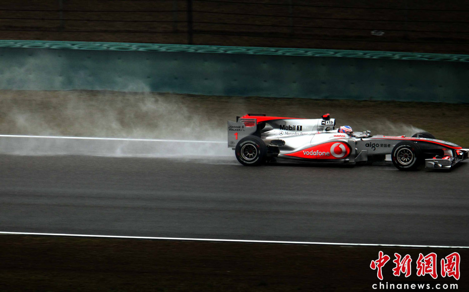 4月18日下午,2010國際汽聯F1世界錦標賽上海站在上海國際賽車場舉行正式比賽,邁凱輪車隊的英國車手巴頓在雨中獲得冠軍、隊友、英國車手漢密爾頓獲得亞軍,梅賽德斯GP車隊的德國車手羅斯伯格獲得季軍。圖為漢密爾頓。中新社記者 任晨鳴 攝