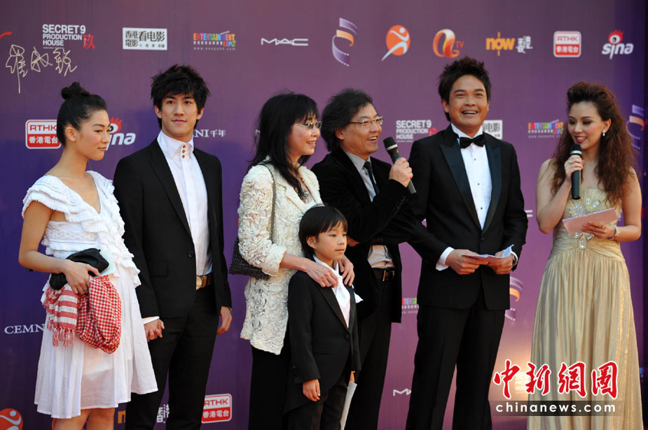 4月18日,參加第29屆香港電影金像獎(jiǎng)?lì)C獎(jiǎng)典禮的舒淇、何超儀、林熙蕾、楊千女華、梁詠琪、劉家良、張家輝、張震、曾志偉、錢嘉樂、關(guān)錦鵬、余文樂、吳彥祖、馮德倫、阮經(jīng)天、趙又廷、許志安、黃子華等明星,在粉絲的歡呼聲中、在媒體記者追逐中,正踏上紅地毯步入香港文化中心大劇院。城中盛事“金像獎(jiǎng)?lì)C獎(jiǎng)典禮”在這舉行。圖為《歲月神偷》導(dǎo)演與主要角色。中新社發(fā) 鄭祚聲 攝
