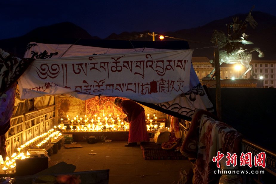 2010年4月18日,青海玉樹結古鎮格薩爾王廣場,雪域阿日香巴拉凈土五明佛學院搭建了帳篷,免費為民眾提供酥油燈,為地震遇難者祈禱。中新社發 盛佳鵬 攝