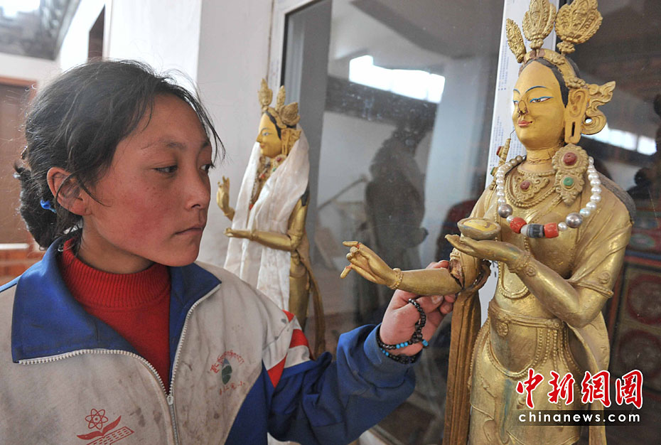 4月19日,新聞記者首次進(jìn)入青海玉樹7.1級強(qiáng)烈地震的震中點(diǎn)上拉秀鄉(xiāng)日麻村,奇跡是全村無一傷亡,位于村中心、正在新修的查榮寺里,兩尊文成公主的塑像局部損壞。中新社發(fā) 賈國榮 攝