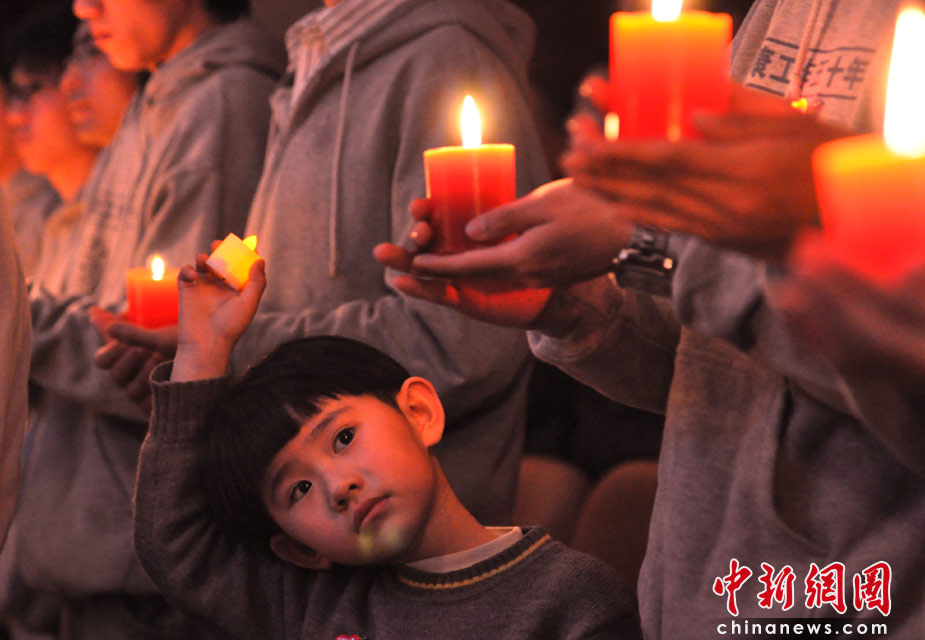 4月19日晚,著名音樂人郭峰在北京清華大學舉辦了“祈福——情系玉樹災區(qū)”現(xiàn)代流行鋼琴燭光音樂會,這是文藝界為抗震救災特獻的首個公益演出。郭峰用鋼琴演奏了《聽海》、《真心英雄》、《心會跟愛一起走》、《堅強的心》、《希望的陽光》等多首主調凝重、祈福、激勵、昂揚的樂曲。現(xiàn)場觀眾是來自首都各大高校的大學生們,他們手中搖曳著燭光,眼含熱淚,在音樂的旋律中為災區(qū)祈福。圖為一位小朋友和大學生們一起點起了燭光。中新社發(fā) 李學仕 攝