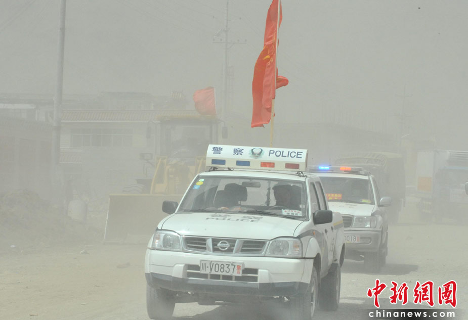 4月中旬青海玉樹地震災區風沙迷漫,警車在結古鎮災區風煙滾滾中艱難穿行。中新社發 賈國榮 攝