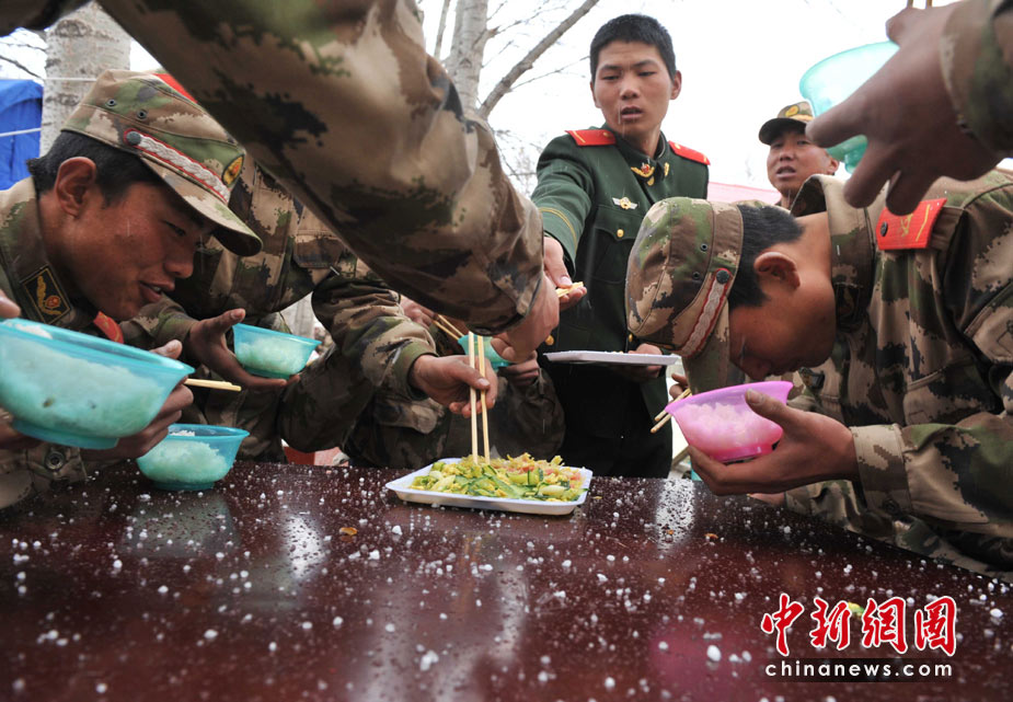 4月20日中午時(shí)分,玉樹地震災(zāi)區(qū)突然雷雹交加,正在現(xiàn)場救援的青海武警總隊(duì)官兵只能在冰雹中吃午餐。中新社發(fā) 賈國榮 攝
