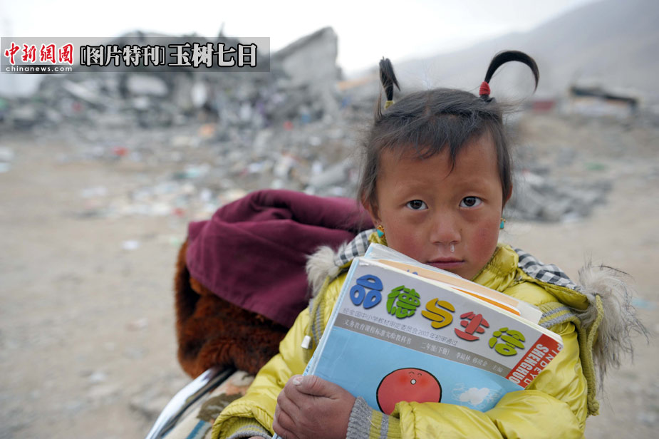 一位上小學(xué)二年級(jí)的女童緊抱著自己的課本,站在震后的廢墟前。中新社發(fā) 陳文 攝
