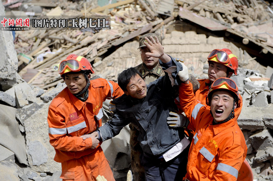 4月15日12時,中國國際地震救援隊在青海玉樹縣結古鎮西北牛賓館廢墟上救出了四名幸存者,其間經歷了三次余震。中新社發 廖攀 攝