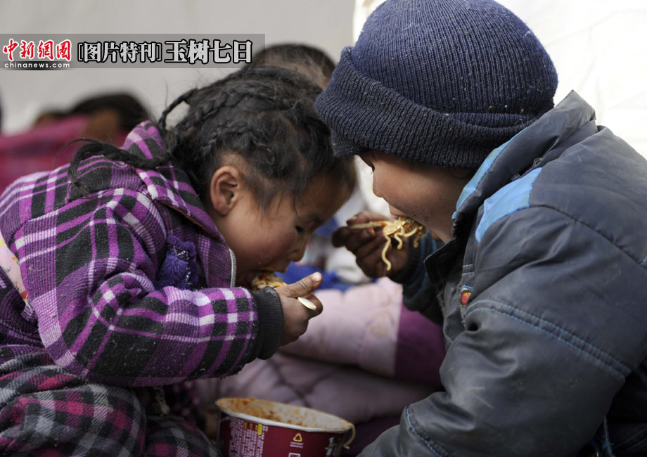 4月15日,青海玉樹縣體育場的地震災民安置點,兩名受災孩童分食一盒方便面,一根不剩。中新社發 廖攀 攝