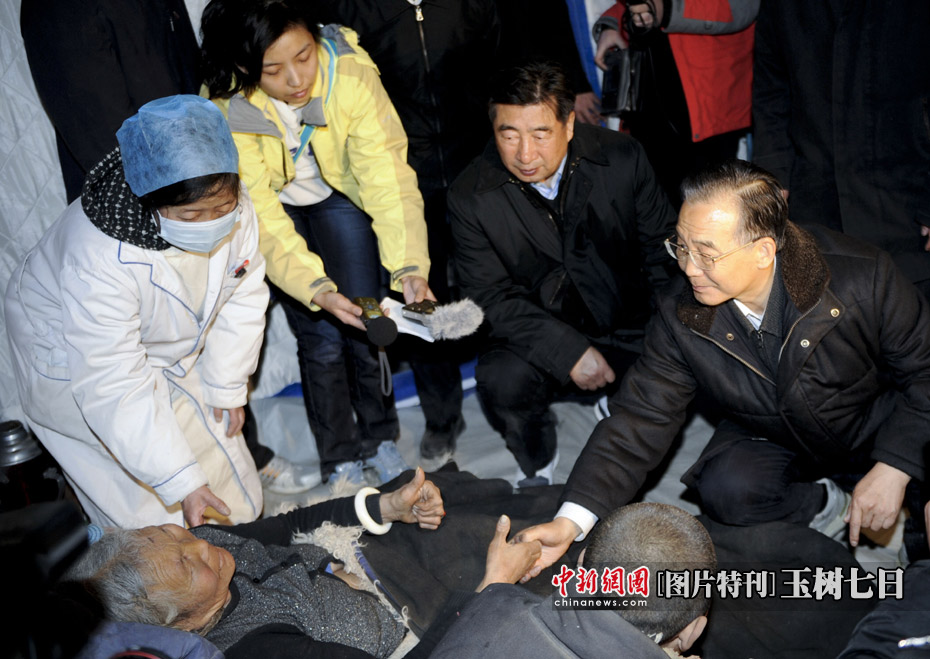 4月15日20時,中國國務院總理溫家寶來到青海省玉樹縣玉樹自治州醫院看望受災民眾。這是溫家寶握著一位藏族大媽的手問候其身體情況。國務院副總理回良玉、國務委員孟建柱參加看望慰問。中新社發 廖攀 攝