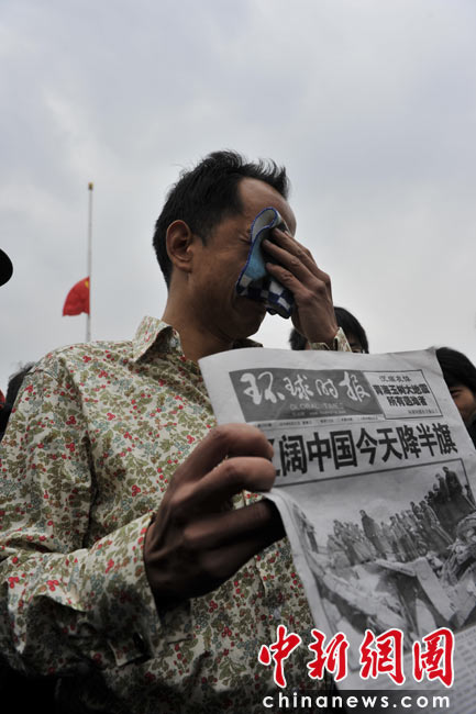 4月21日,為表達(dá)全國各族人民對青海玉樹地震遇難同胞的深切哀悼,中國國務(wù)院決定,舉行全國哀悼活動,全國和駐外使領(lǐng)館下半旗志哀,停止公共娛樂活動。圖為北京天安門廣場上哀悼遇難者的民眾。中新網(wǎng)記者 金碩 攝
