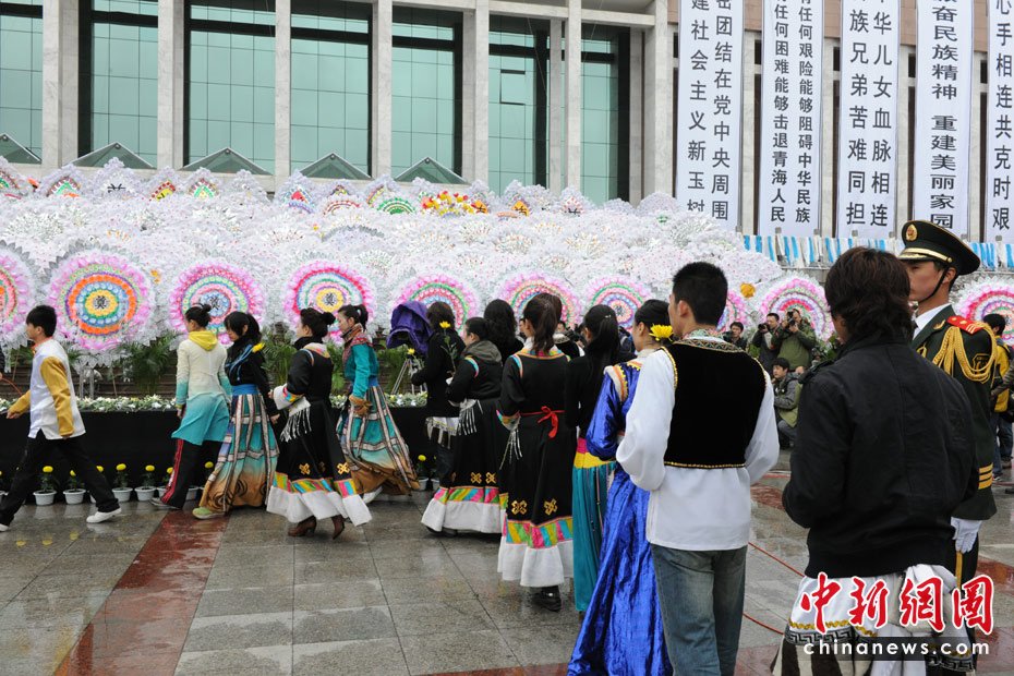 21日上午9時許,西寧各界民眾冒雪陸續來到該市最大的廣場——新寧廣場,悼念玉樹地震遇難同胞。中新社記者 符永康 攝