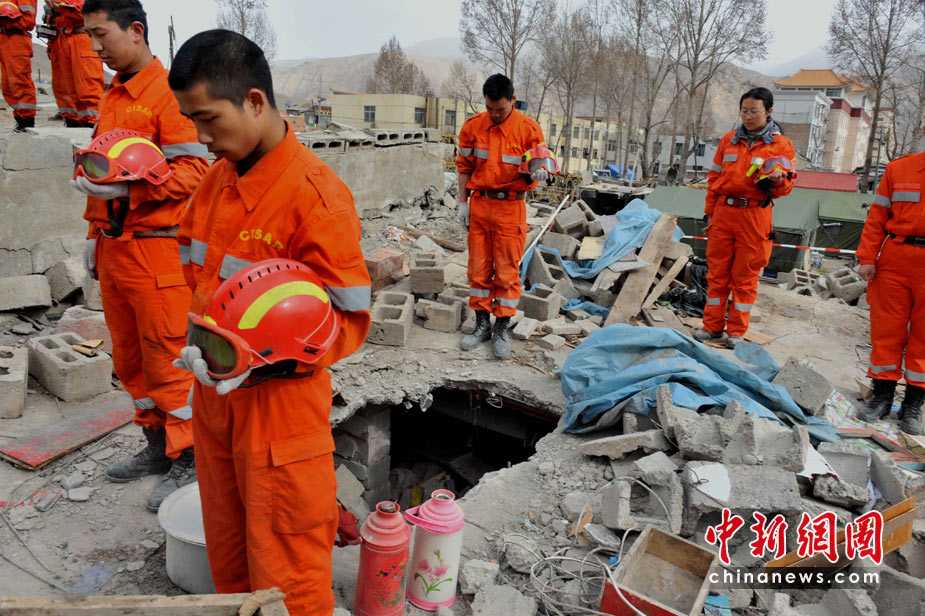 4月21日10時(shí),中國(guó)國(guó)家救援隊(duì)在青海玉樹地震災(zāi)區(qū)搜尋廢墟上默哀,深切哀悼地震遇難同胞。中新社發(fā) 賈國(guó)榮 攝