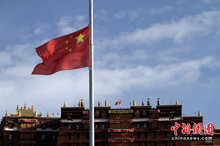 4月21日,西藏布達拉宮廣場上舉行降半旗儀式。同時,布達拉宮紅宮頂端的紅旗也降半旗,向青海玉樹地震遇難者志哀。中新社發(fā) 徐長安 攝
