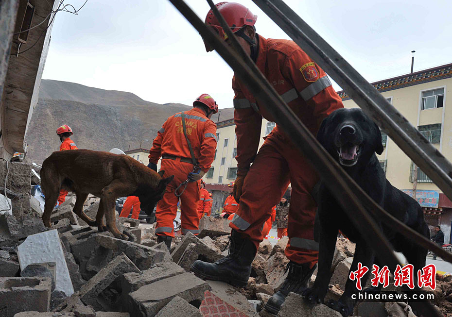 搜救犬黑貝玉樹地震廢墟上的一個清晨