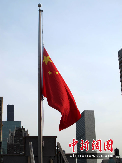 21日,中國常駐聯合國代表團位于紐約的駐地下半旗致哀,悼念在玉樹地震中遇難的同胞。聯合國大廈屹立遠處。中新社發 孫宇挺 攝
