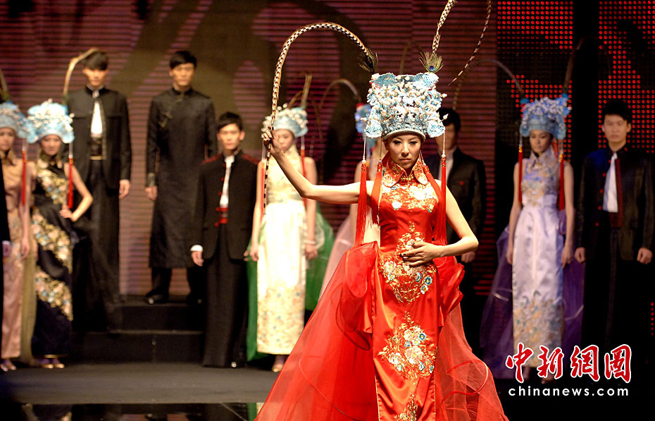 4月20日晚,首屆海西國際時裝周在福建石獅閉幕,本屆時裝周吸引了來自海峽兩岸的紡織服裝界企業家和知名服裝設計師。期間舉辦了12場時裝品牌和設計師作品動態發布會。圖為模特展示古今潮流結合的服裝。王東明 攝