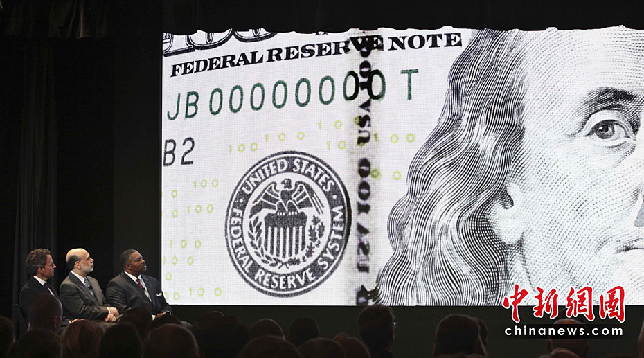 圖為新款百元美鈔發(fā)布會(huì)現(xiàn)場(chǎng)