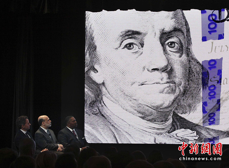 4月21日,美國(guó)財(cái)政部和美聯(lián)儲(chǔ)共同發(fā)布新版100美元面值的紙幣票樣。此次發(fā)行新版百元美鈔旨在防范假鈔,同時(shí),老版美元仍將繼續(xù)流通。圖片來(lái)源:中國(guó)新聞網(wǎng)