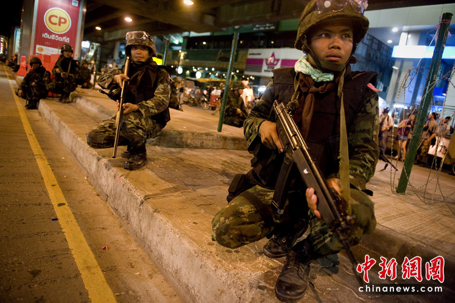 泰國首都曼谷市中心的沙拉登交叉路口天鐵站22日晚接連發生5起爆炸,造成最少5人死亡,百人受傷,其中10人重傷。圖為泰國警察封鎖了市中心的街道。