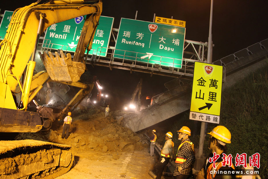 4月25日, 臺灣一條交通要道、“北二高”基隆段發(fā)生山崩意外,傾瀉而下的土石壓垮一座高架橋,并覆蓋道路約200米,據(jù)傳有人車被埋。圖為工程人員連夜開挖,展開大搜救。 中新社發(fā) 董會峰 攝