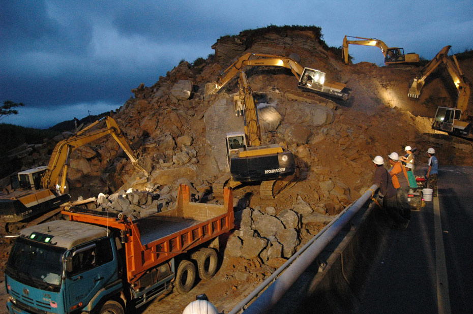 4月25日, 臺灣一條交通要道、“北二高”基隆段發生山崩意外,傾瀉而下的土石壓垮一座高架橋,并覆蓋道路約200米,據傳有人車被埋。圖為工程人員連夜開挖,展開大搜救(圖片來源:“中央社”)。