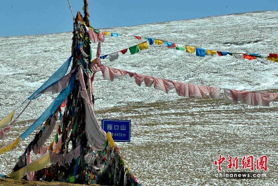 屬于長江、黃河、瀾滄江三江源地區的青海玉樹地震災區,自然保護區的18個核心區域中,有10個位于玉樹州境內,占總面積的72%。4月下旬,記者深入災區縱深各地,災后重建正面臨保護生態環境、為三江源建起一道生態屏障的難題;近日緊迫的防疫工作,必須使用滅菌效果好、對環境無污染的消毒劑。圖為高原山口的經幡依舊。中新社記者 賈國榮攝