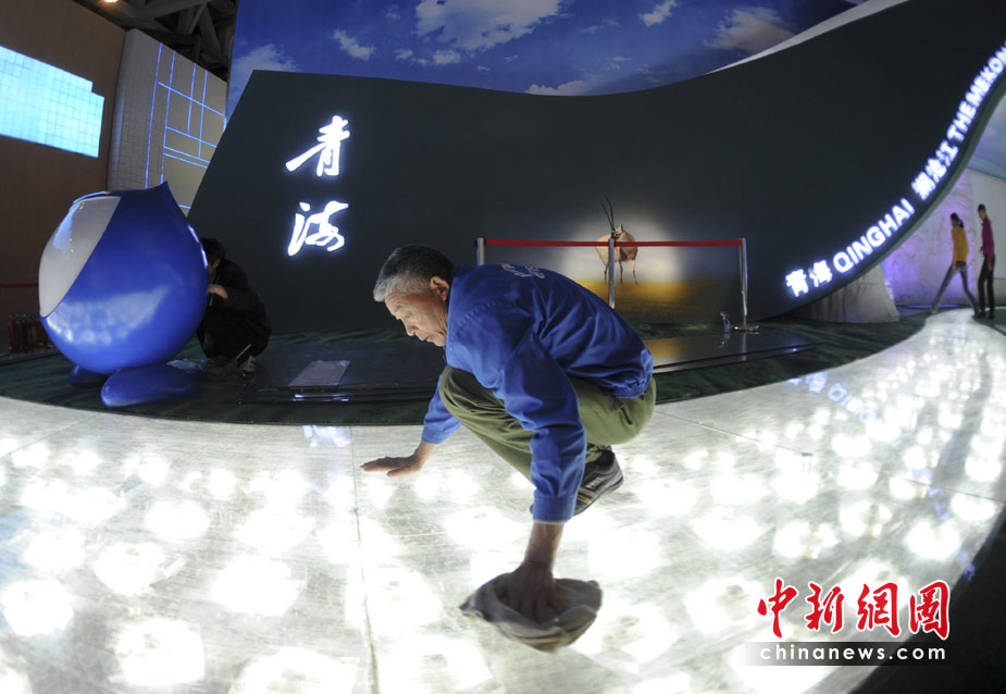 4月27日,中國省區市聯合館中的青海館,工作人員維護設施,展覽工作準備就緒。中新社發 廖攀 攝