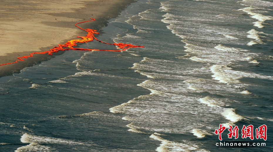 4月30日,在美國路易斯安那州海岸,為阻隔原油擴(kuò)散而設(shè)的護(hù)欄帶被海風(fēng)浪沖到岸邊。當(dāng)天,美國總統(tǒng)奧巴馬下令調(diào)查墨西哥灣石油鉆井平臺爆炸事件,以避免將來類似事件再次發(fā)生。平臺爆炸沉沒后泄漏的原油當(dāng)天已漂至美國沿岸。圖片來源:中國新聞網(wǎng)