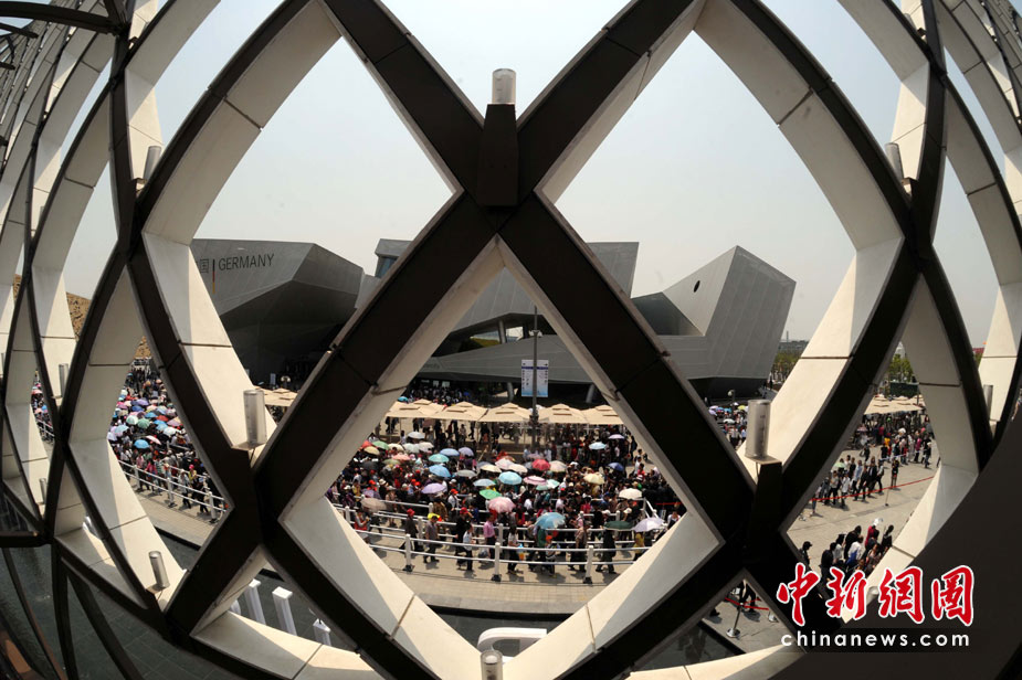 5月2日,上海世博園開園第二天迎來客流高峰。在正午的陽光下,從法國館的藝術(shù)格柵中眺望德國館,別有一番景觀。 中新社發(fā) 廖攀 攝