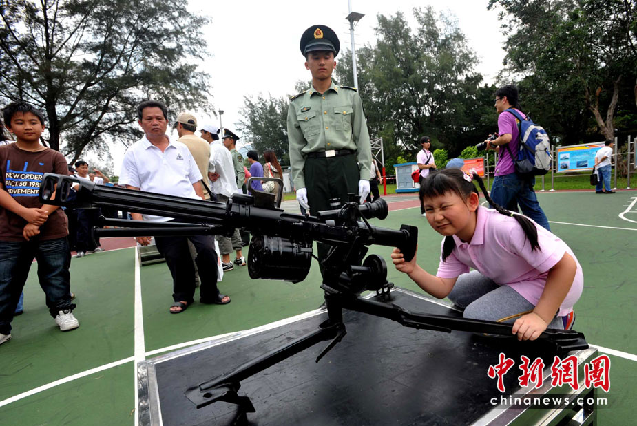 為慶祝“五一”國際勞動節,進一步增進與香港社會各界相互溝通與交流,中國人民解放軍駐香港部隊5月2日開放了石崗軍營。圖為香港市民近距離參觀武器展示。 中新社發 鄧慶樂 攝
