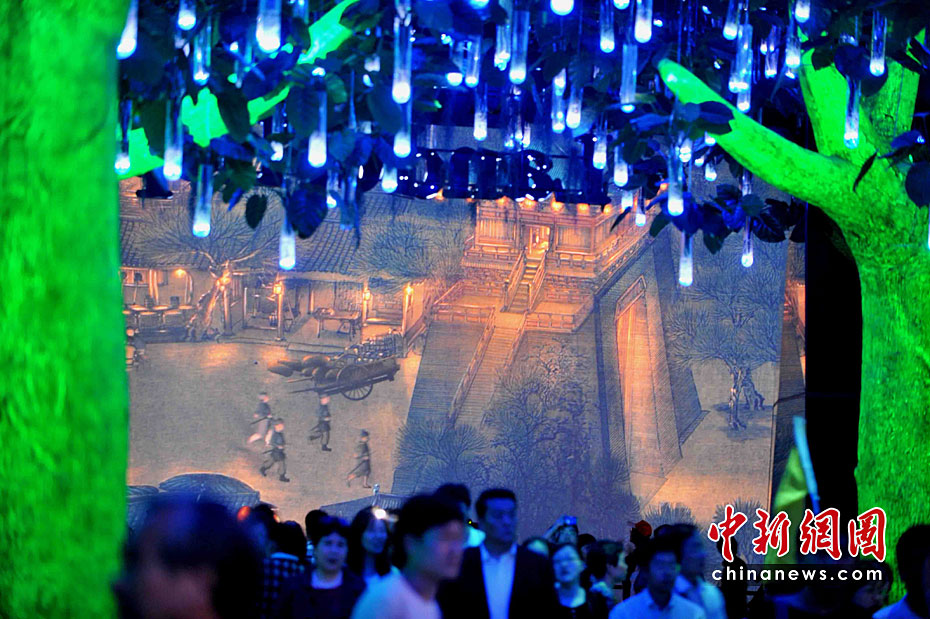 5月2日,中外觀眾依然最熱捧上海世博會中國館的“鎮館之寶”——巨幅放大電子動態版的北宋畫家張擇端名作《清明上河圖》。此世博版的《清明上河圖》高6.3米,長130余米,約是原圖的30倍,需要12臺電影級的投影儀同時工作。整個活動畫面以4分鐘為一個周期,盡展宋朝盛世的都市日夜風情。中新社記者 賈國榮 攝