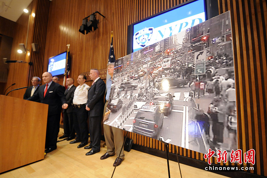 美國當地時間5月2日,紐約市警察局長凱利在記者會上公布了紐約時代廣場爆炸事件現場照片。同時他還指出,沒有證據顯示巴基斯坦塔利班策劃了1日傍晚發生在紐約時報廣場上的未遂汽車炸彈襲擊事件。圖片來源:中國新聞網