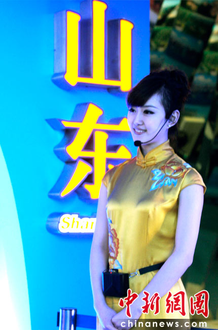 5月3日,上海世博會中國山東館一位禮儀小姐始終笑容可掬,許多參觀者都喜歡與外秀內慧的她拍一張留影照。當一對夫婦推著嬰兒車經過時,她迅速上前幫助抬下階梯。她因而享有全場最善解人意的禮儀小姐美稱。中新社發 賈國榮 攝