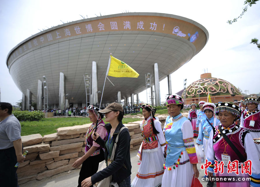 5月4日,上海世博園,游客走過以月亮船位造型的沙特館。 中新社發 盛佳鵬 攝